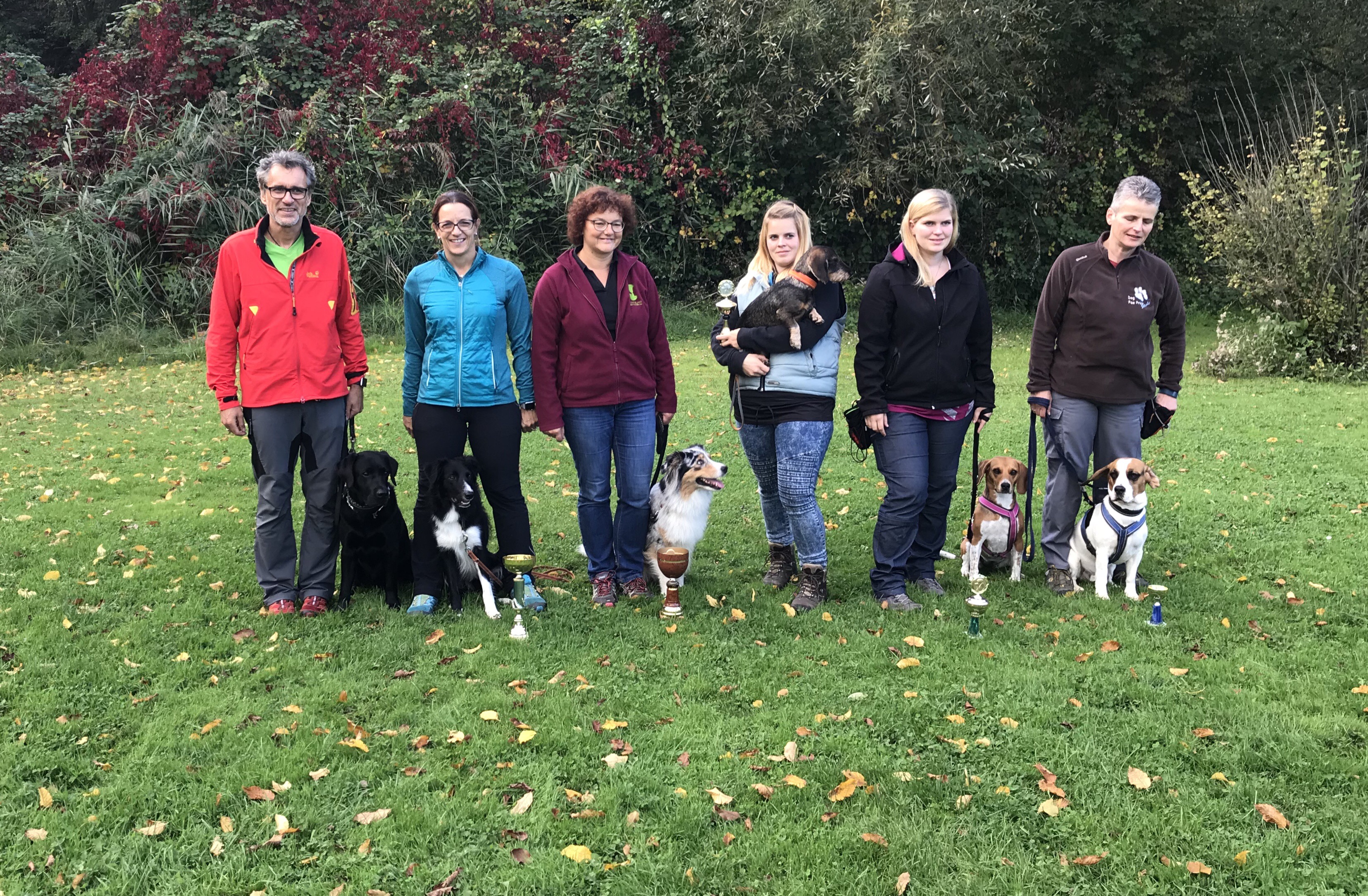 Oli mit Gizmo, Yvonne mit Miles, Bettina mit Amy, Daniela mit Rocky, Sarah mit Amira, Petra mit Snoopy